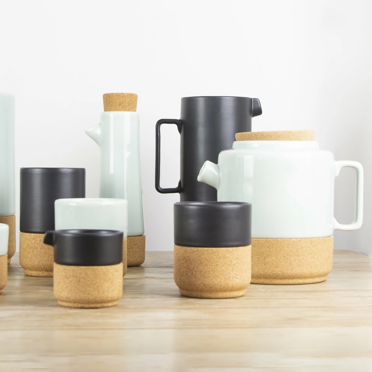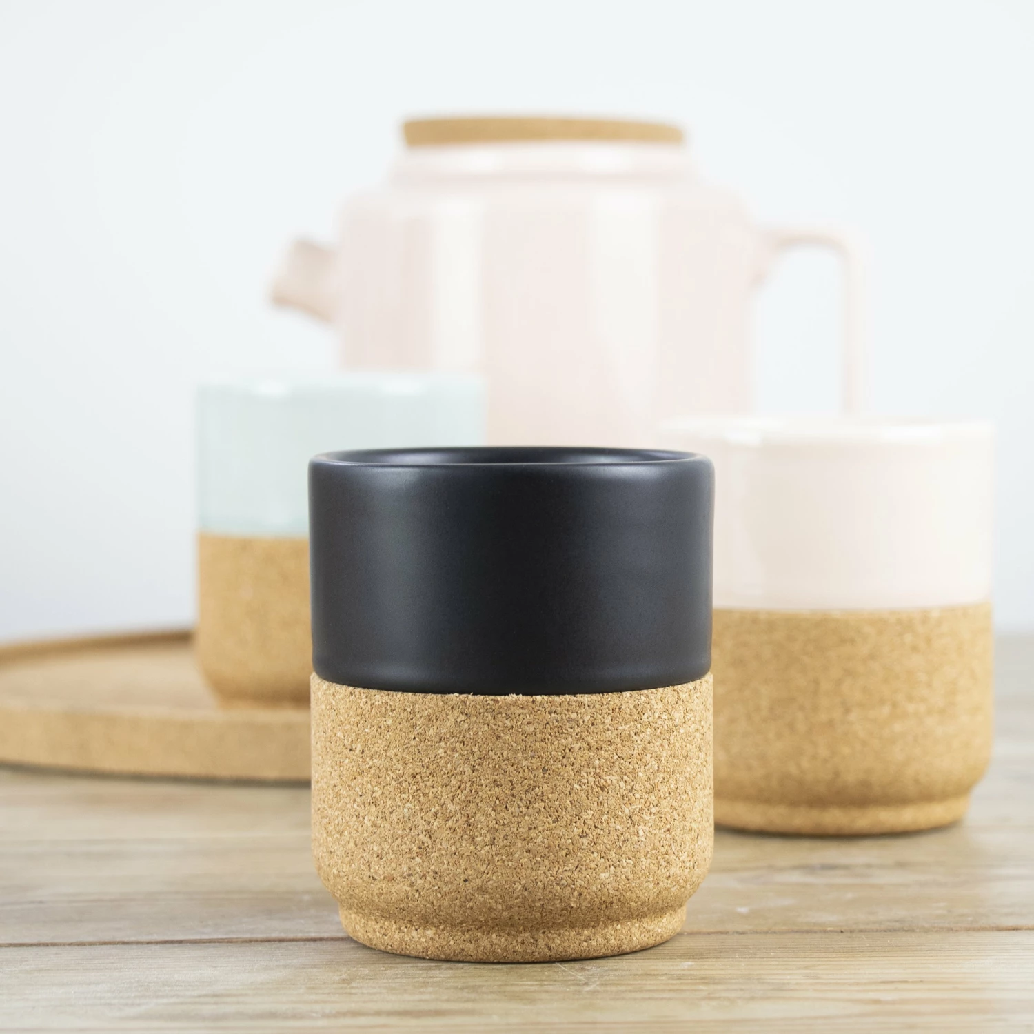 Cork + Pottery = Earthware Collection Contemporary eco design – feels great to hold.The Cork and Ceramic parts sit well together and easily come apart for practicality and ease of cleaning. Ceramic – Dishwasher Friendly & Cork – hand wash. Available in Rose Pink, Aqua, Cream, Matt Black & Storm Grey A contemporary collection designed and made in Portugal.