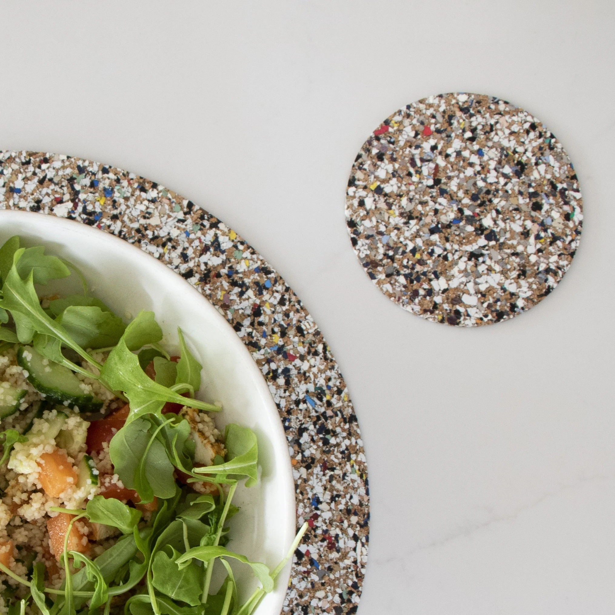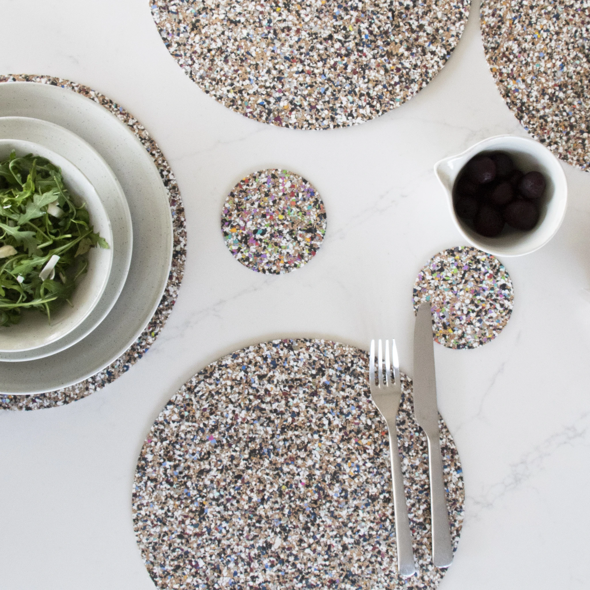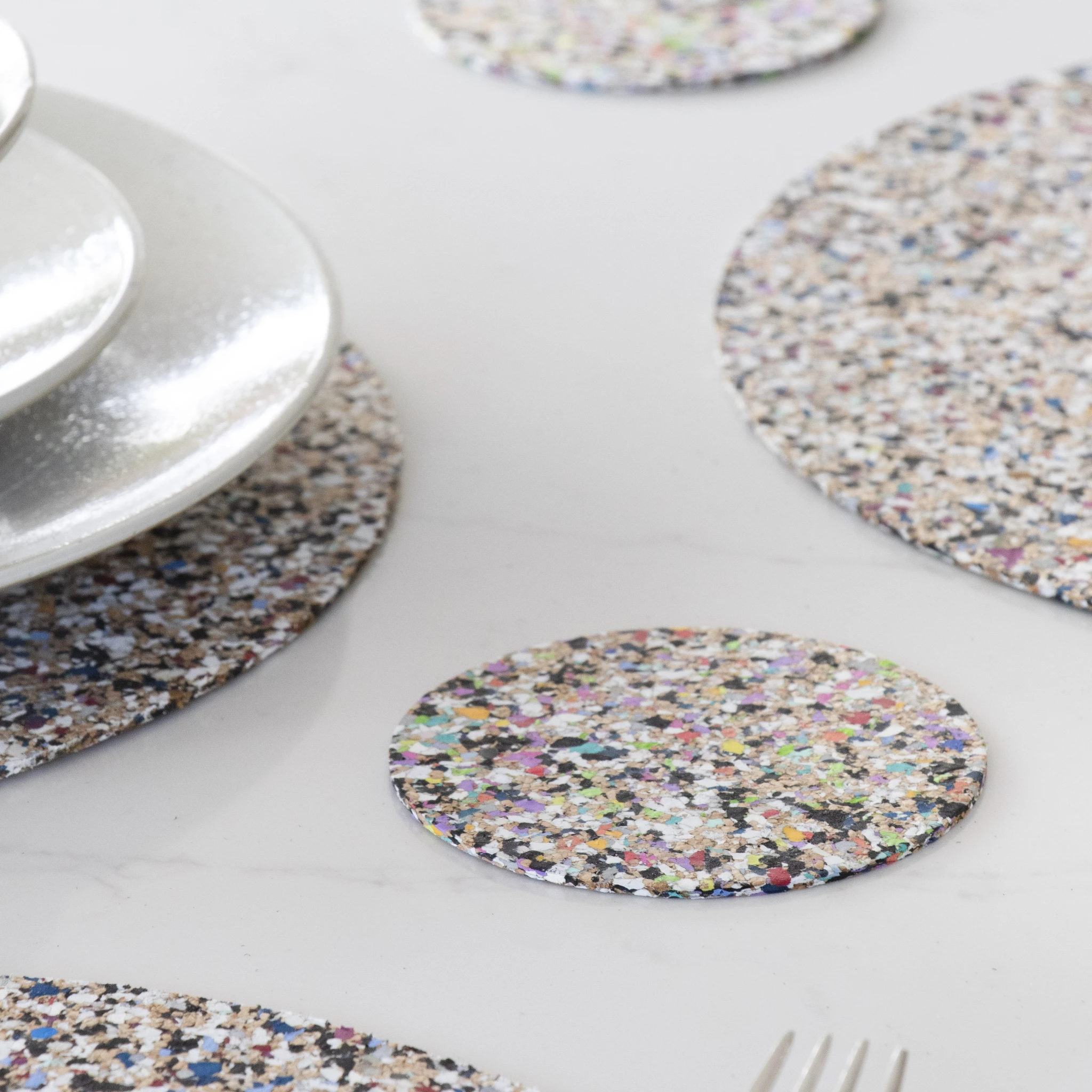 A rainbow of EVA plastic – sourced from our oceans is nestled playfully amongst sustainably sourced cork. Each coaster is completely unique! Bright Blues and reds pop, while pastel pinks and purples compliment the monochromes and warm specs of brown. You can dine with a clear conscious, knowing you’ve done your bit for the environment without compromising on style!