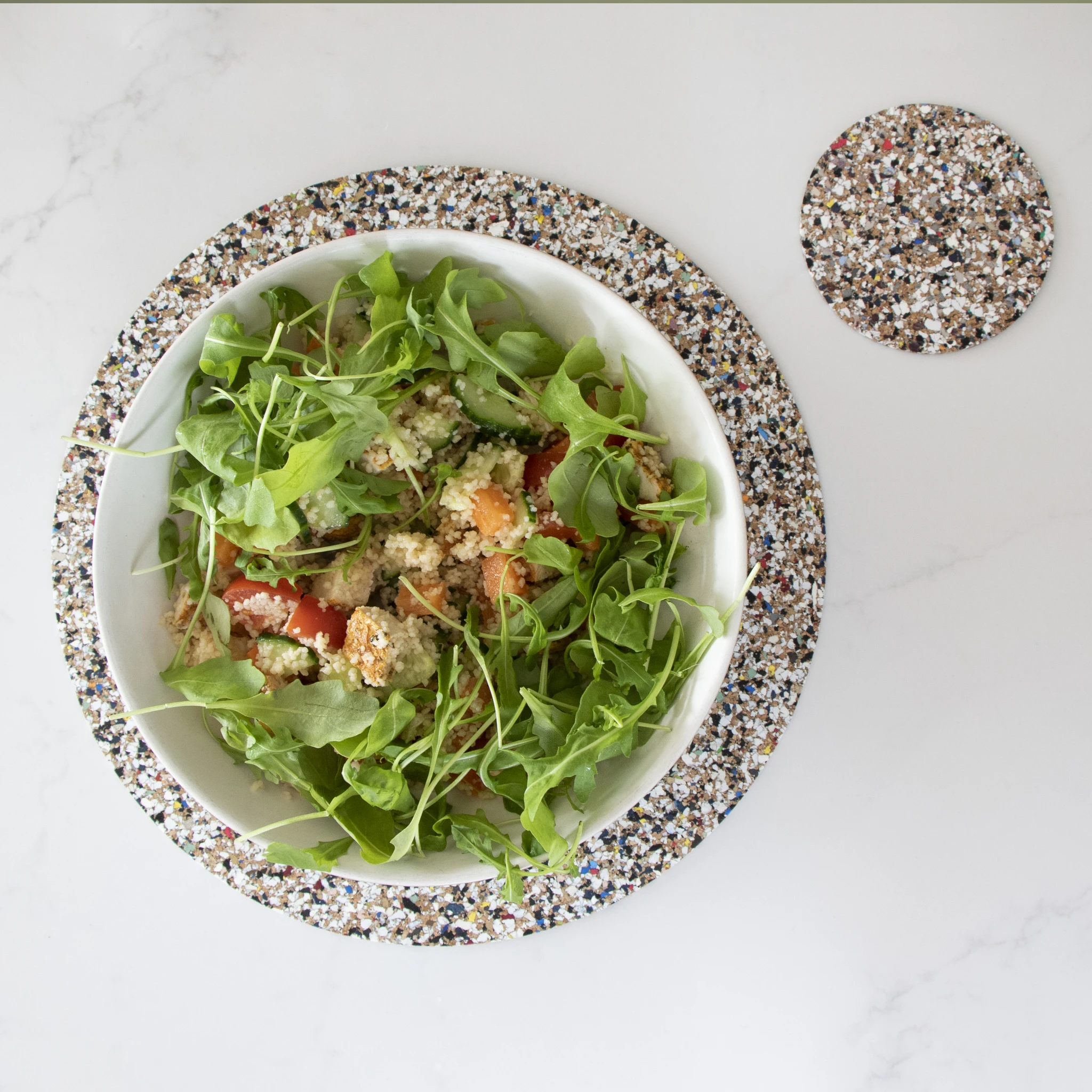 A rainbow of EVA plastic – sourced from our oceans is nestled playfully amongst sustainably sourced cork. Each mat is completely unique! Bright Blues and reds pop, while pastel pinks and purples compliment the monochromes and warm specs of brown. You can dine with a clear conscious, knowing you’ve done your bit for the environment without compromising on style!