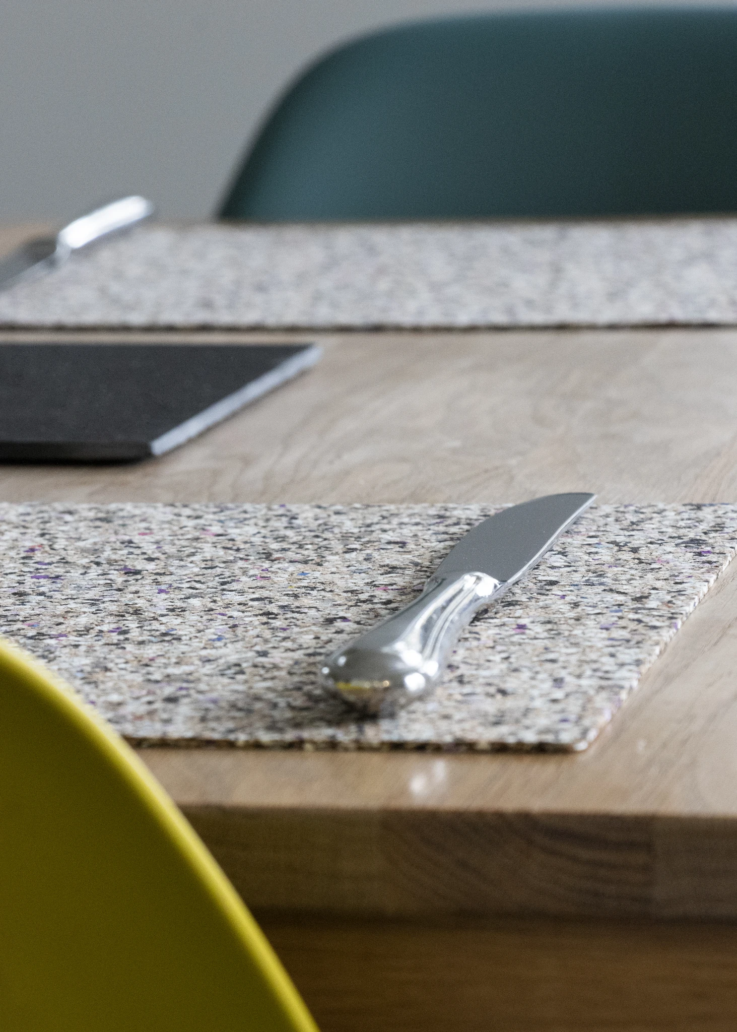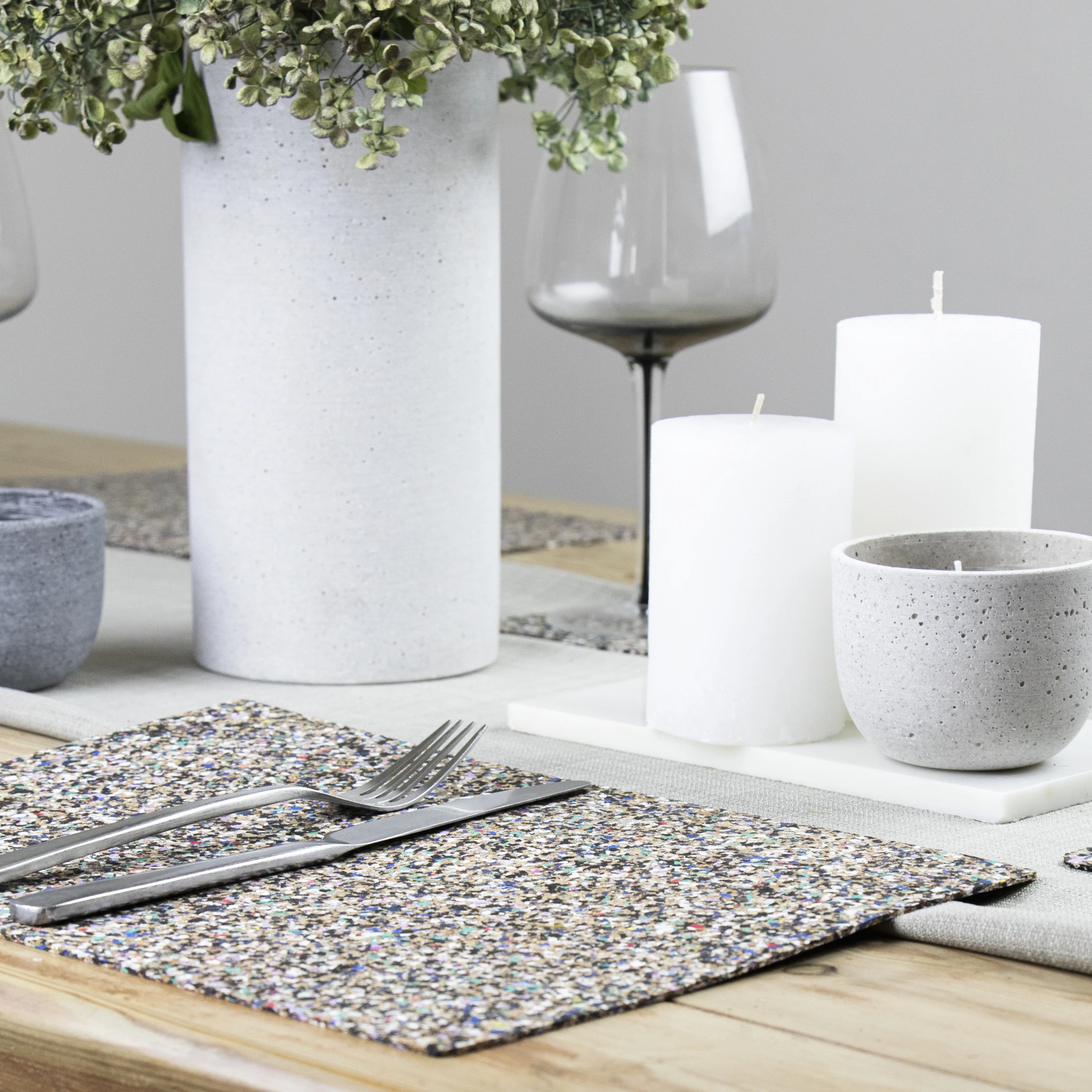 A rainbow of EVA plastic – sourced from our oceans is nestled playfully amongst sustainably sourced cork. Each mat is completely unique! Bright Blues and reds pop, while pastel pinks and purples compliment the monochromes and warm specs of brown. You can dine with a clear conscious, knowing you’ve done your bit for the environment without compromising on style!