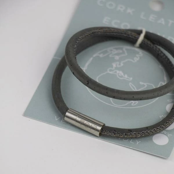 Handmade in Cornwall from Vegan friendly Cork Leather – for him and for her. Comfortable to wear with a strong magnetic clasp. Band length when laid flat Large – 43 cm Smoked | Twist | Grey | White | Natural CORK Simple recycled card packaging
