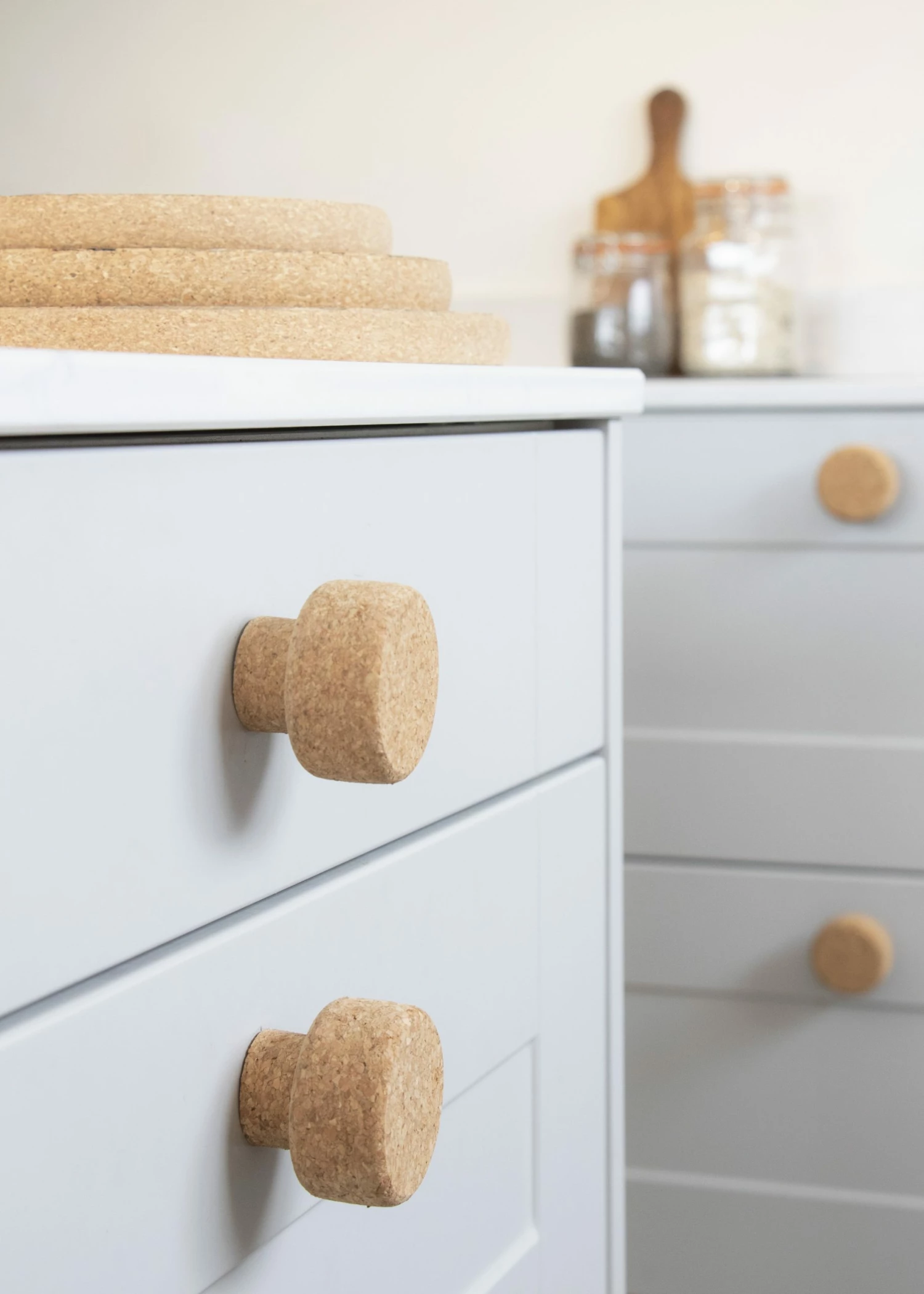 Contemporary Round Cork Knobs/Hooks – beautifully tactile and versatile. Perfect for making a statement on cupboards or as hooks for hanging coats and bags up! Stylish and eco-friendly. Cork is sustainable, renewable, and completely natural, just the thing for an eco lifestyle. Mix and match sizes and shapes and create a piece of art for your hallway that is super practical!