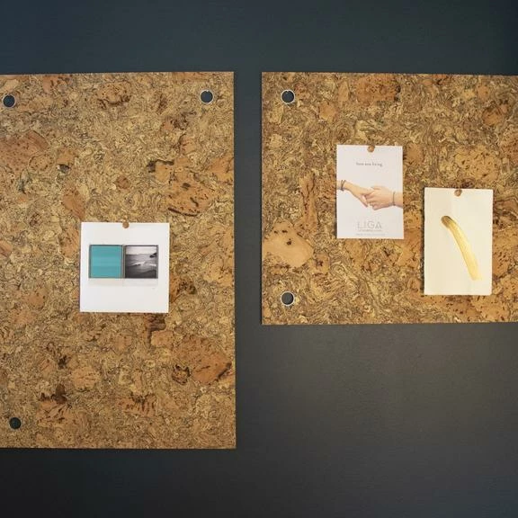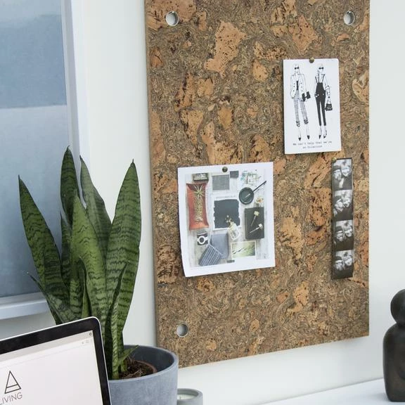 Cork memo board with Liga’s ice grey cork material covering both sides. Aluminium eyelets to allow easy hanging for portrait or landscape.