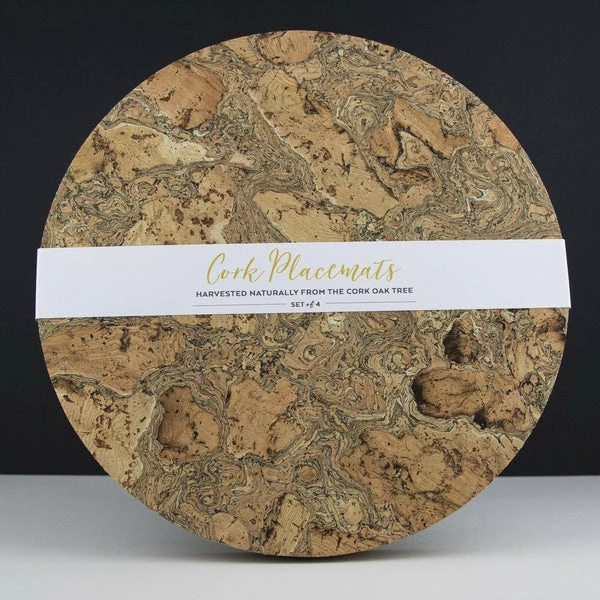 Set of four naturally smoked Cork Round Oversized Placemats. Sets come with paper band to wrap the 4 placemats – making it the perfect gift. Cork is sustainable, renewable and recyclable – practical too, water impermeable and easily wipe clean and insulating. Size: 300mm x 5mm
