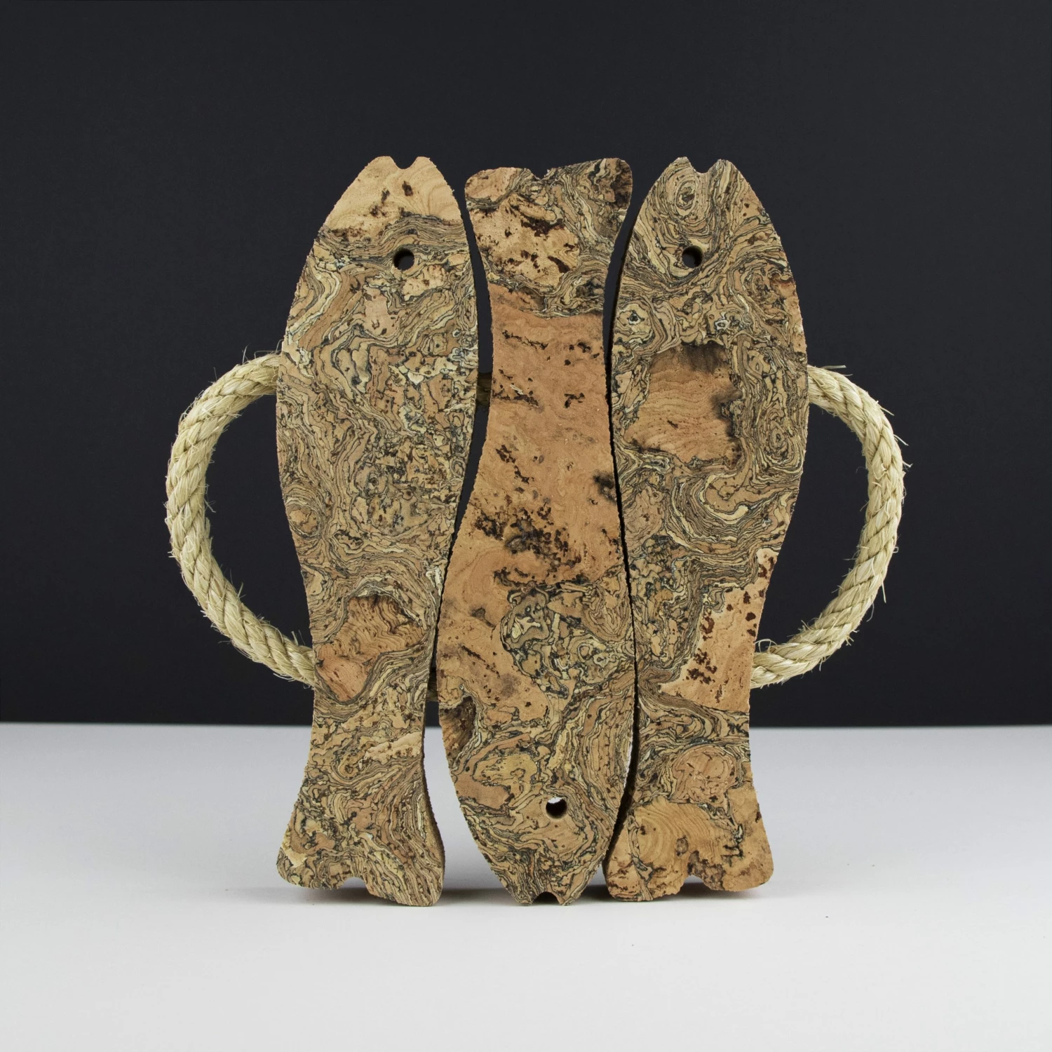 Coastal Collection Ice Grey Three Fish Cork Trivet – sustainable, environmentally friendly, heatproof, shock absorbent, lightweight and tactile. With natural insulating properties and water impermeability cork is the perfect heatproof material for keeping your table, or kitchen surfaces safe, and its beautiful too! This elegant trivet is designed and finished in Cornwall. Our sustainable ice grey cork, is harvested once every nine years without felling trees. Enhance your home while allowing endangered wildlife to keep theirs. Also available in Five Fish and Seven Fish. Size: 14 x 20 x 2 cm (measurements without rope).