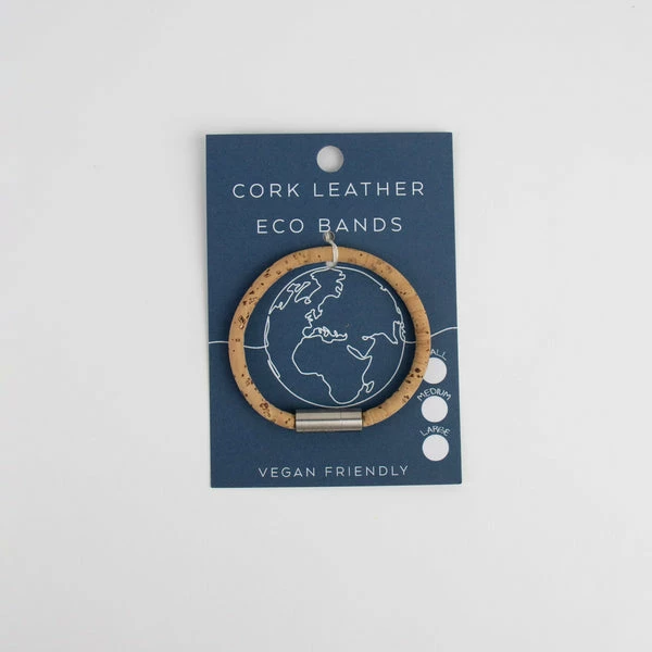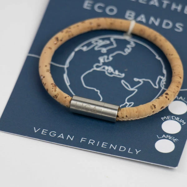 Handmade in Cornwall from Vegan friendly Cork Leather – for him and for her. Comfortable to wear with a strong magnetic clasp. Band length when laid flat Medium: 39cm | Large: 43cmSmoked | Twist | Brown | White | Natural CORK Simple recycled card packaging