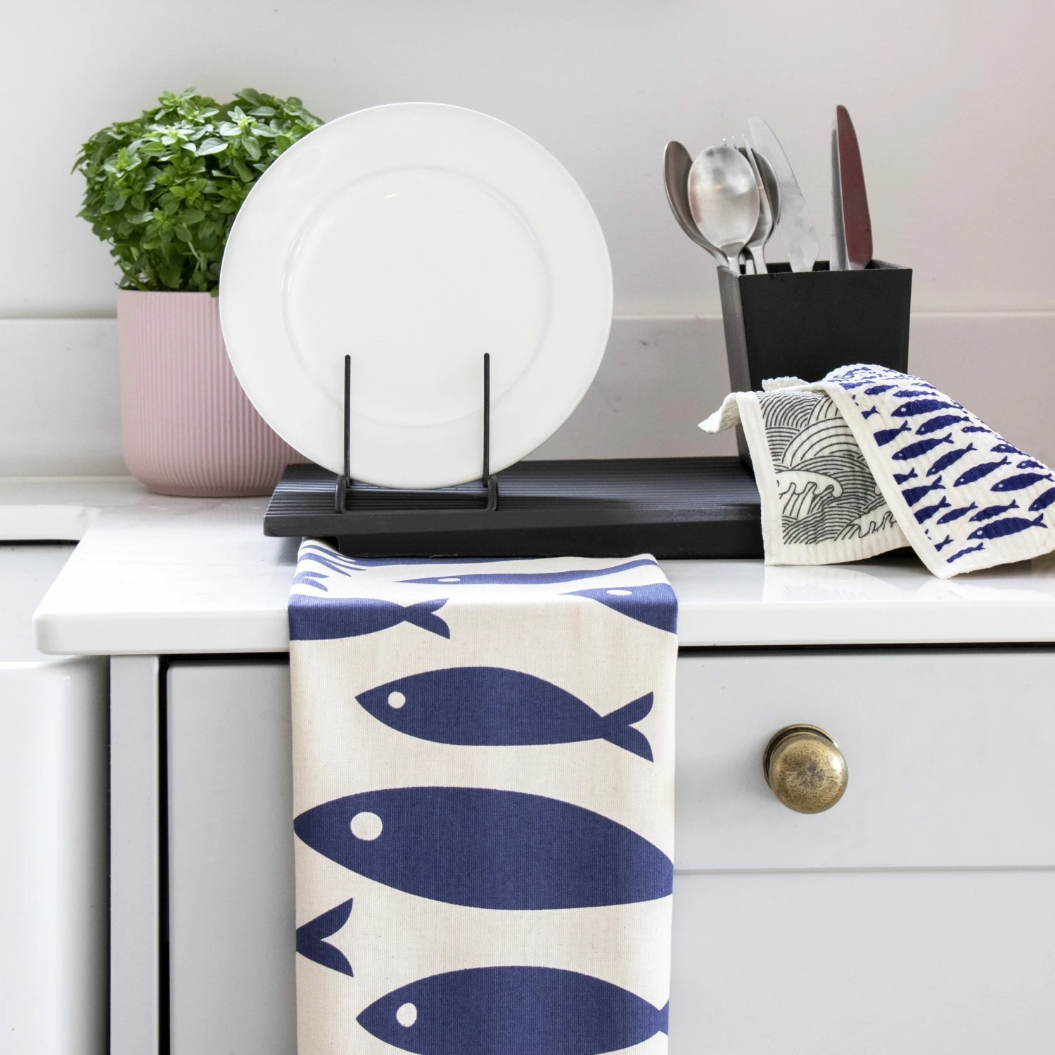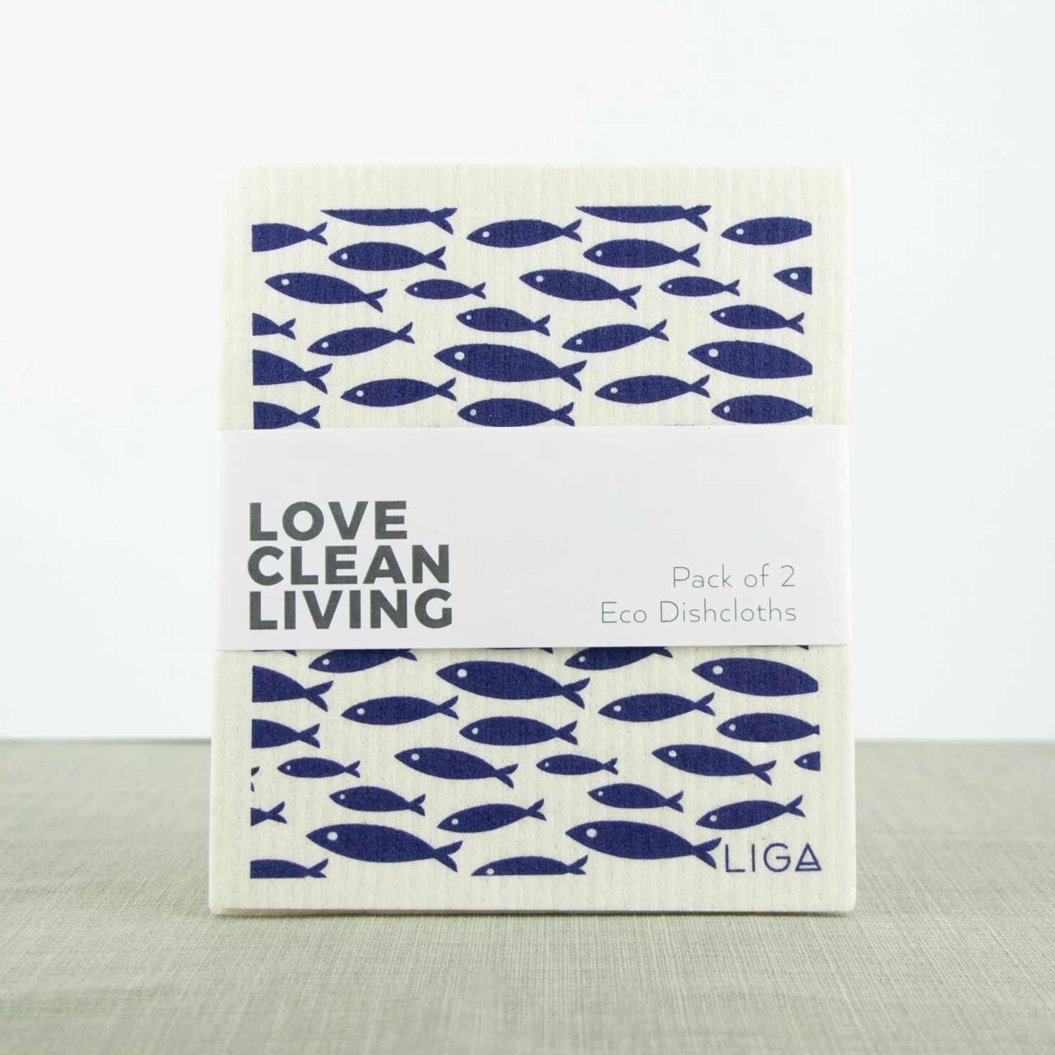 Love Clean Living – pack of two environmentally friendly dishcloths. Set of two designs – Fish & Wave Bring the spirit of coastal living to your kitchen. They are super absorbent and printed with two coastal designs, fish and wave. Perfect for those looking to live a more sustainable lifestyle. Just pop in the dishwasher to clean! Material: 70% Cellulose 30% Cotton Size: 20 x 17 cm Matching Organic Cotton Tea Towel available