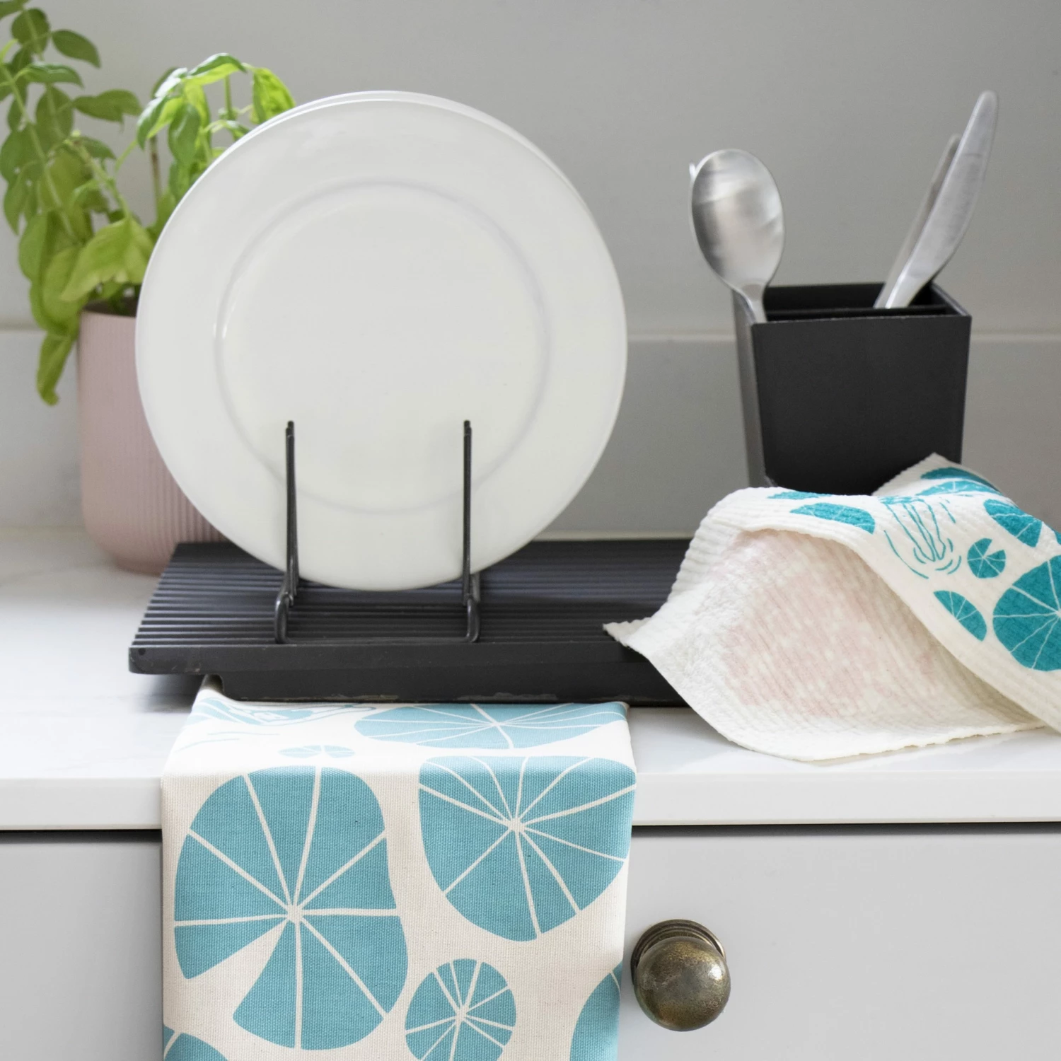 Re-use | Recycle | Washable – our set of 2 eco dishcloths. Wild Swimmers in Teal & Hydrangea in Soft Pink Easy to clean in the dishwasher / washing machine. Pop in the compost at the end of life. Material: 70% Cellulose 30% Cotton – totally compostable. Size: 20 x 17 cm Matching Organic Cotton Tea Towel available