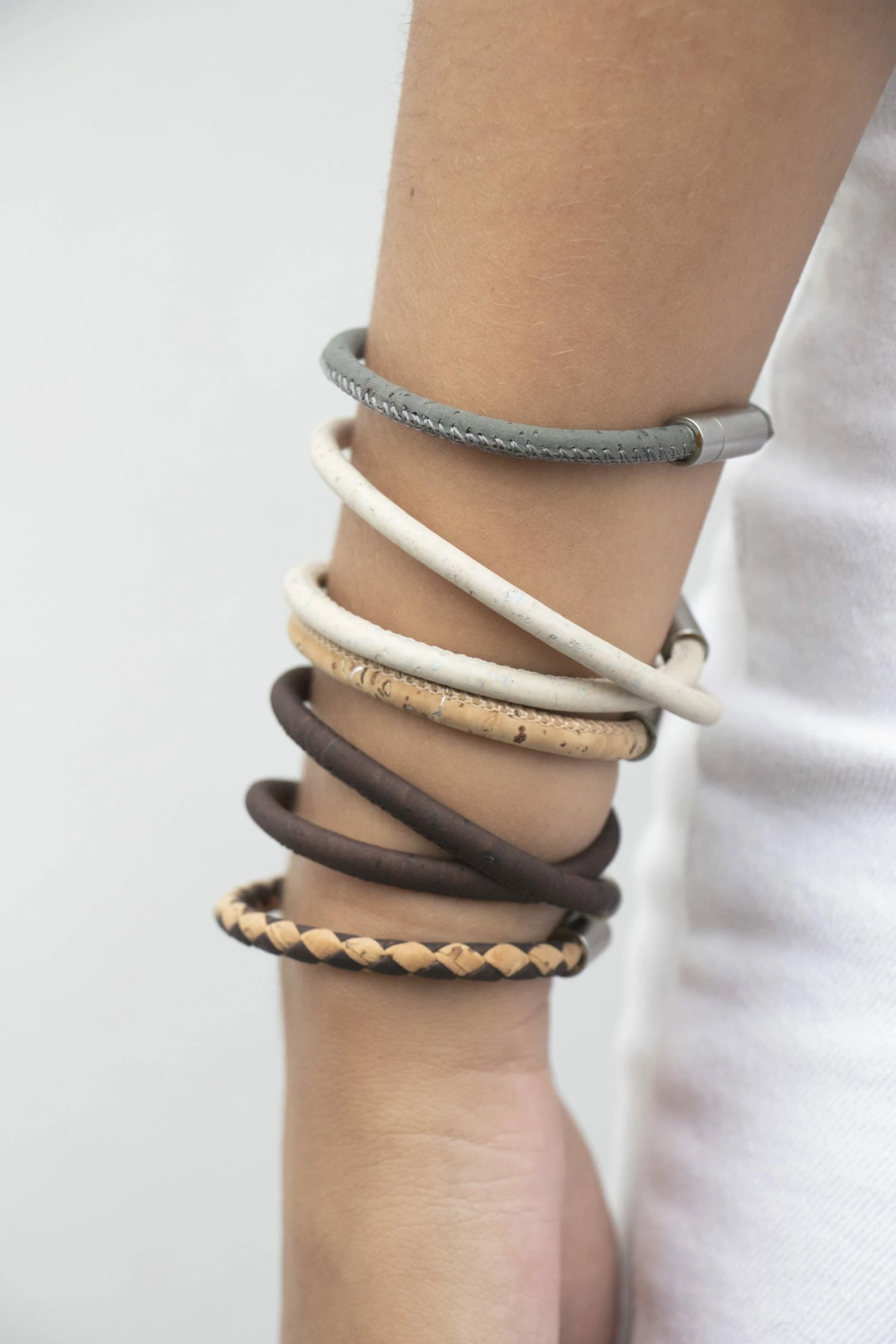Handmade in Cornwall from Vegan friendly Cork Leather – for him and for her. Choose from 5 colour-ways in three sizes in a single or double wrap. Comfortable to wear with a strong magnetic clasp. Band length when laid flat Small – 17 cmMedium – 19 cm Large – 21 cm Smoked | Twist | Grey | White | Natural CORK Simple recycled card packaging | Single wrap £10.95 in all sizes and colours | Double Wrap £12.95 VIEW OUR FULL RANGE HERE