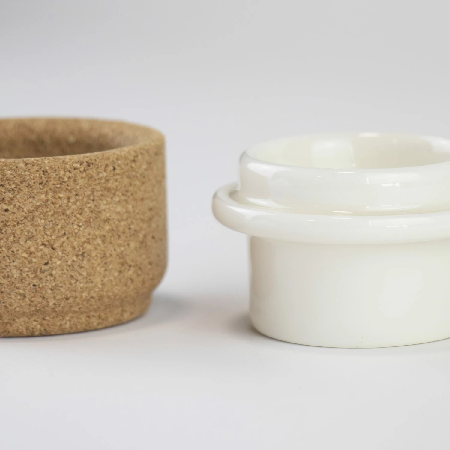 Cork + Pottery = Earthware Collection A lovely cream sturdy egg cup to keep your boiled egg warm. The Cork and Ceramic parts sit well together and easily come apart for practicality and ease of cleaning. Ceramic – Dishwasher Friendly & Cork – handwash. A contemporary collection designed and made in Portugal. Size: H5.5 W6.5cm Material: Cream Ceramic and Cork Matching cork and pottery products also available.