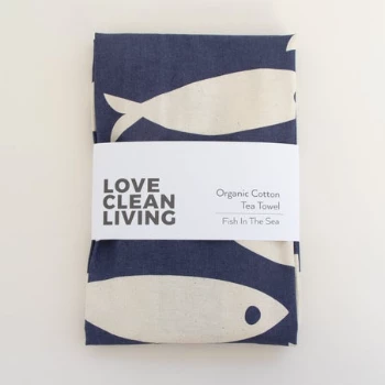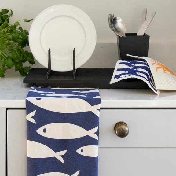 We love Liga’s new organic range of tea towels in coastal designs. This is the Fish In The Sea tea towel in organic cotton.