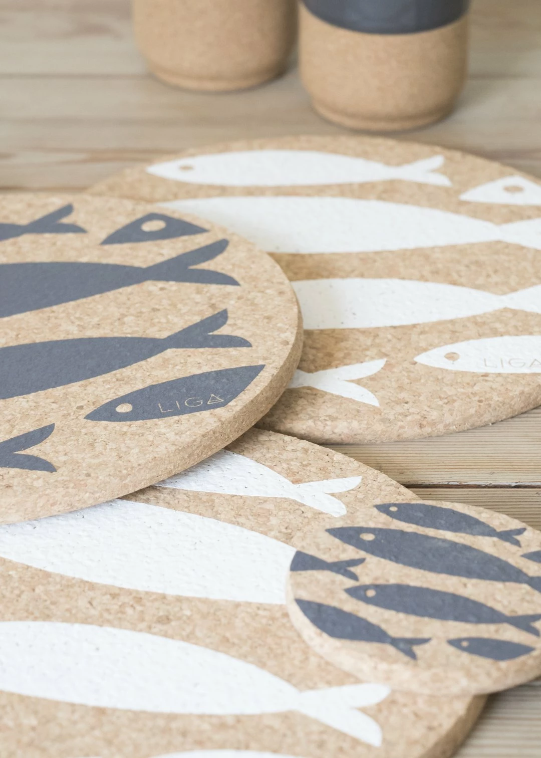 Grey Fish Cork Coasters and Placemats – environmentally friendly, heatproof, shock absorbent, lightweight and tactile.