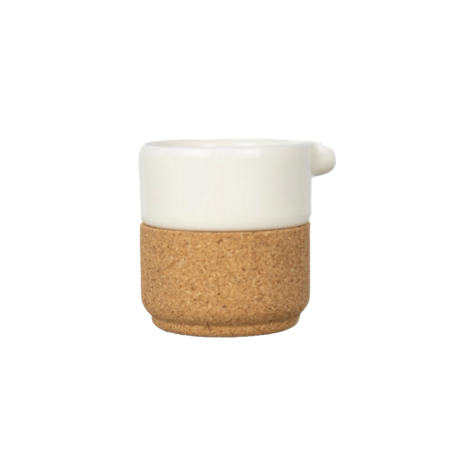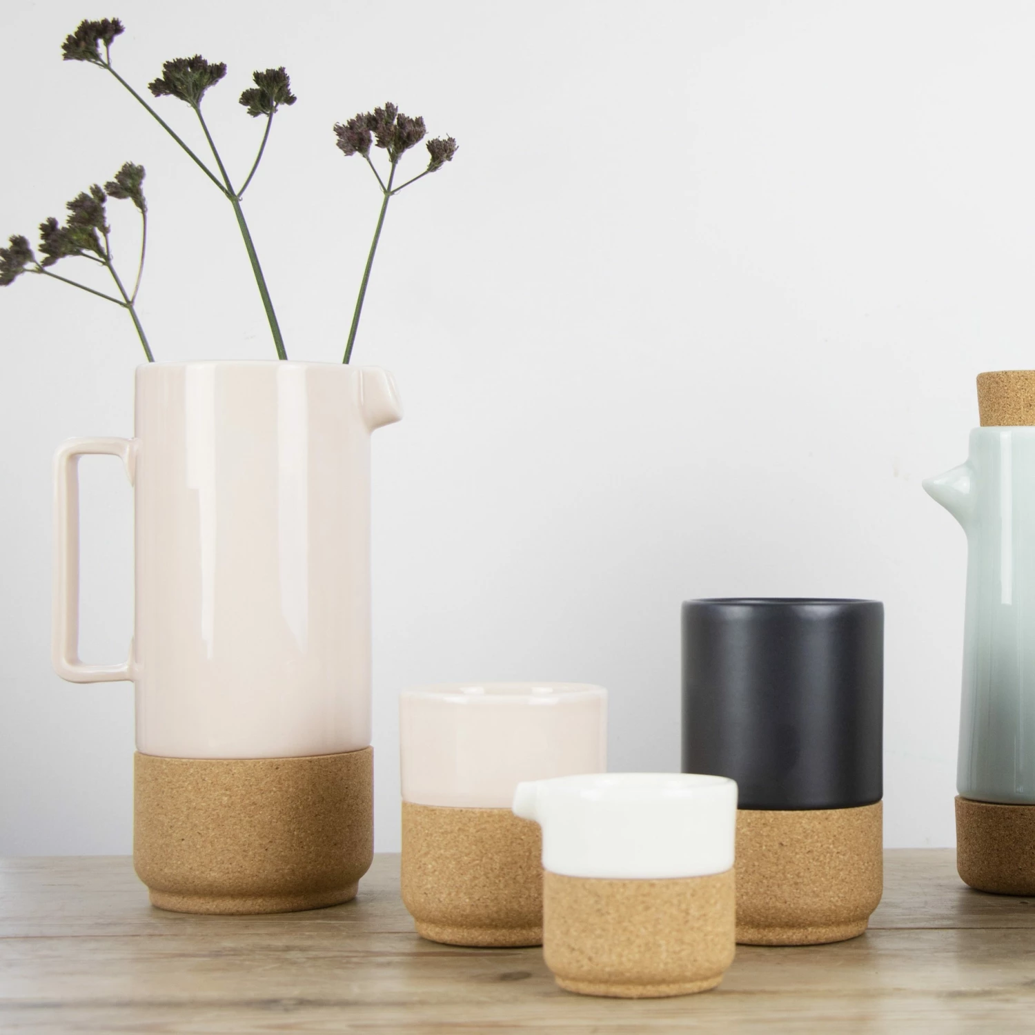 Cork + Pottery = Earthware Collection Milk Jug The Cork and Ceramic parts sit well together and easily come apart for practicality and ease of cleaning. Ceramic – Dishwasher Friendly & Cork – handwash. A contemporary collection designed and made in Portugal. Size: 70 x 66 (75 inc spout) mm Also available in Storm Grey, Pink, Mint & Matt Black.