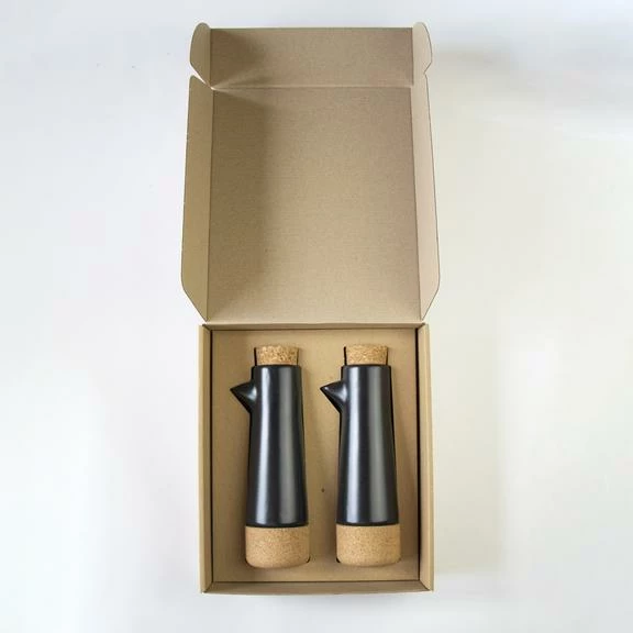 Set of 2 Oil & Vinegar Dispensers, beautifully packaged in a recycled card gift box with sleeve. Cork + Pottery = Earthware Collection A contemporary collection designed and made in Portugal. Cork and Ceramics both have a strong tradition in Portuguese History. Single Dispenser Size: 215 x 75 mm The Cork and Ceramic parts sit well together and easily come apart for practicality and ease of cleaning. Ceramic – Dishwasher Friendly & Cork – hand wash.