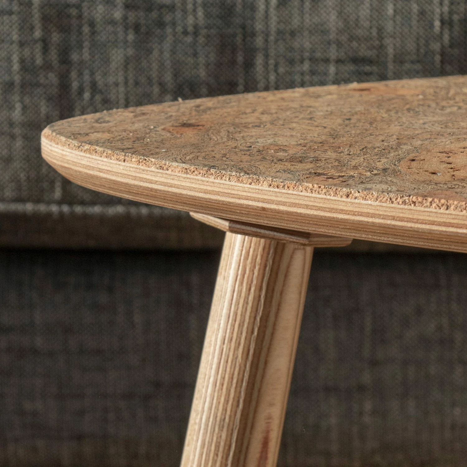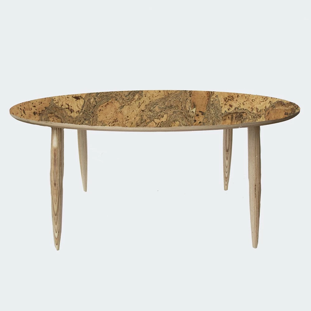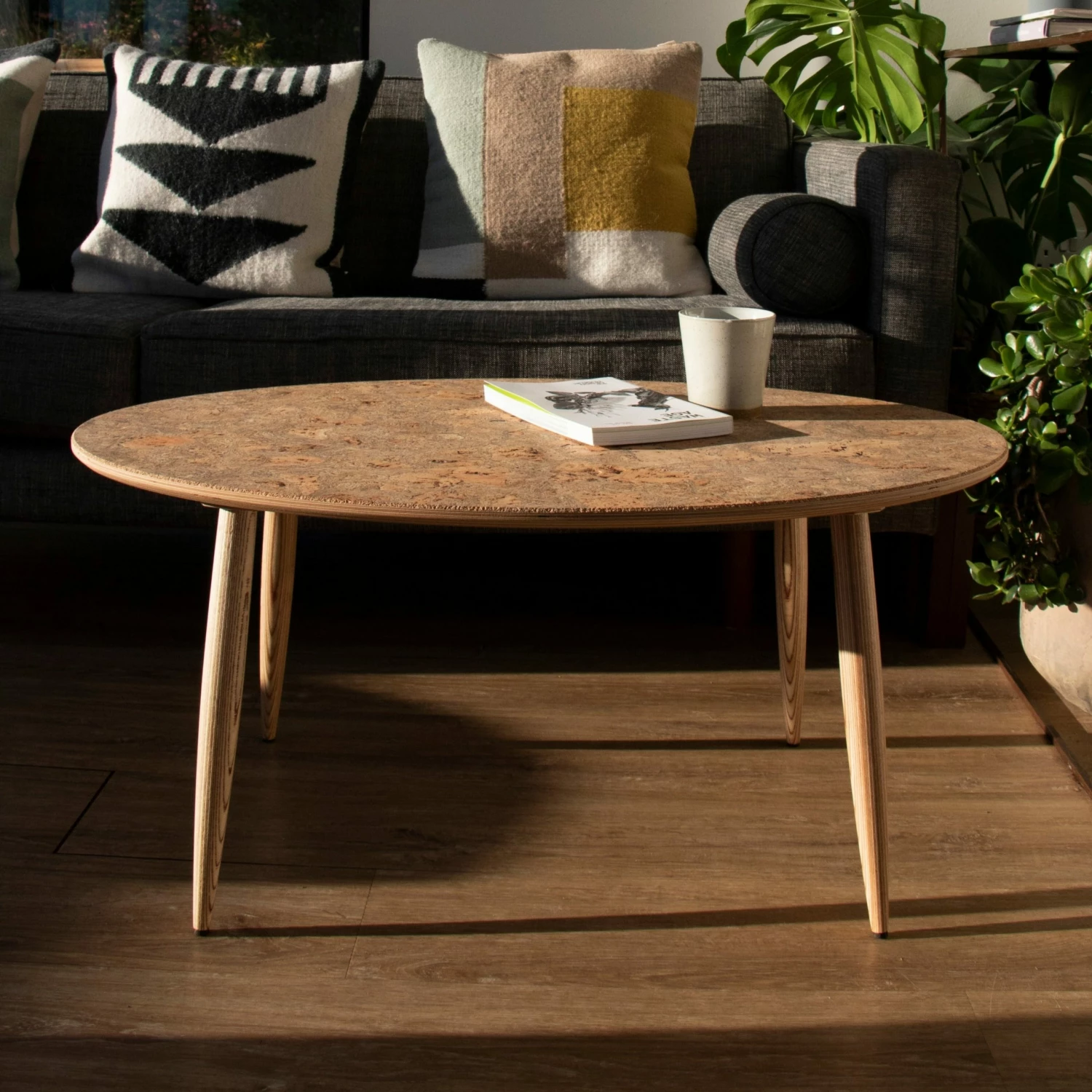 Handmade in Cornwall exclusively for LIGA. Sustainable – easy to assemble no tools required – simple screw on legs. Choose from Beach Clean or Ice Grey Cork both with plywood. Comes flat packed in delivery box Oval Table size: H40 x D90 X W60 cm