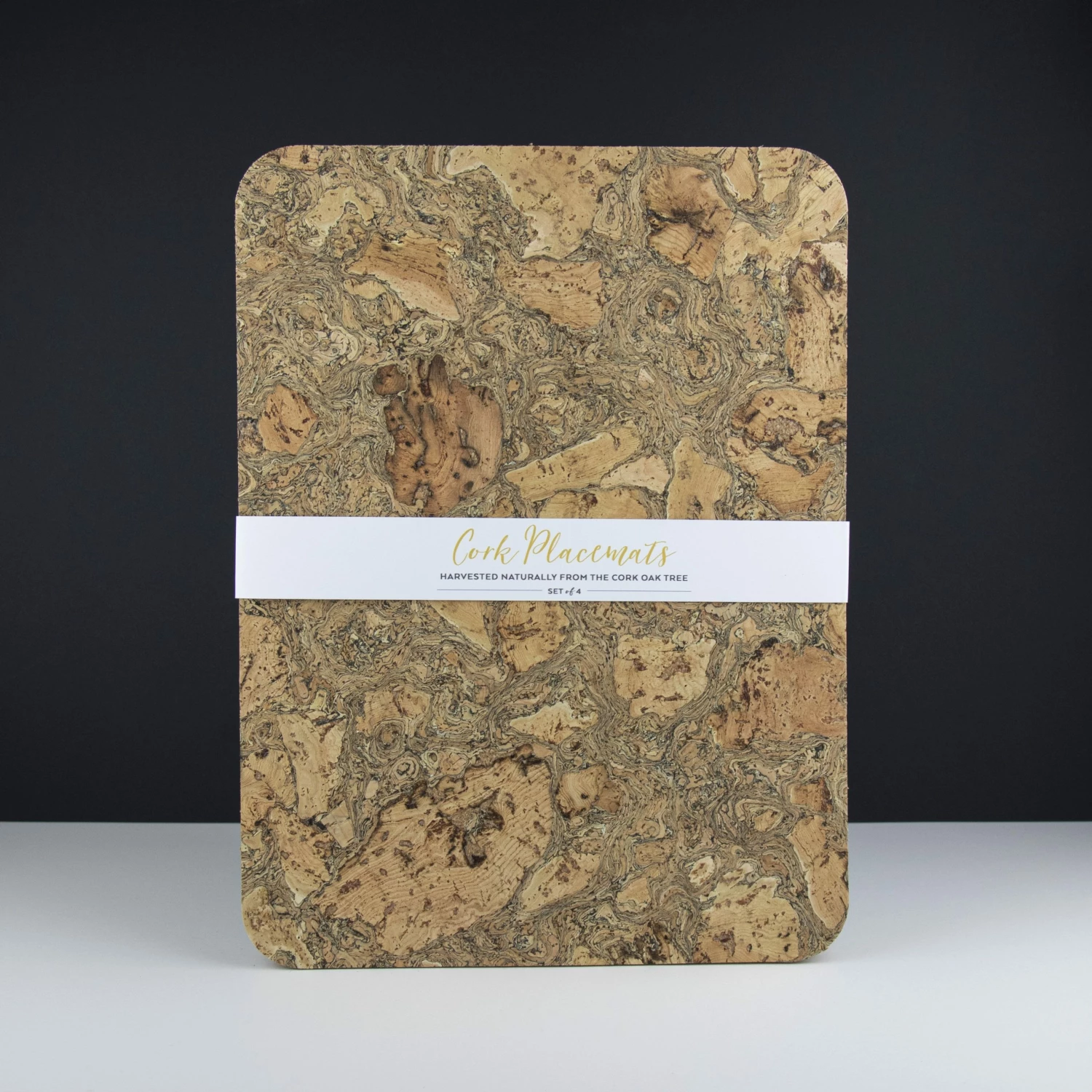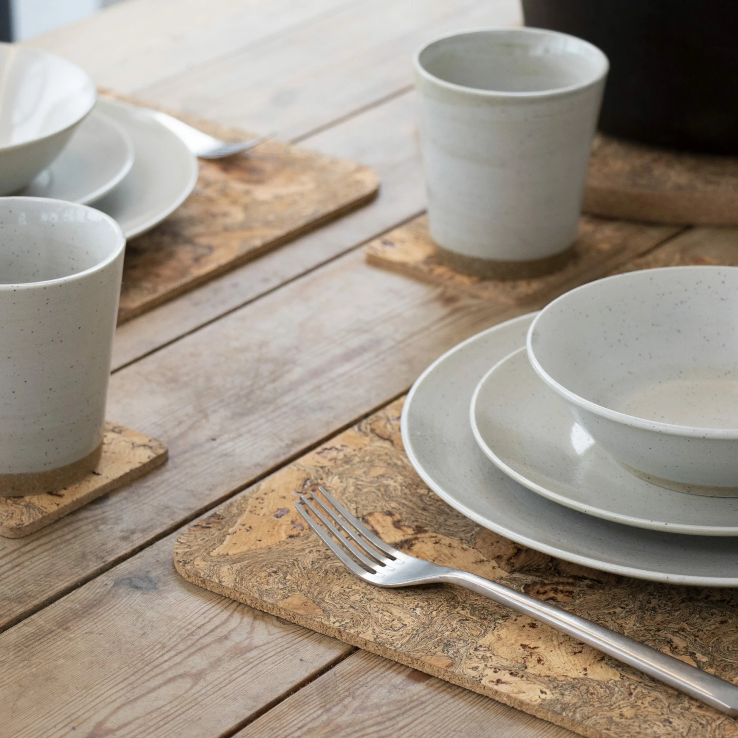 Set of four Rectangle Ice Grey Cork Placemats. Sets come with paper band to wrap the 4 cork tablemats – making it the perfect gift. Sustainable, environmentally friendly, practical and all natural, they are smoked to create a marbled finish. With natural water impermeability qualities they are quick and easy to clean. The sustainable cork, is harvested once every nine years without felling trees. Enhance your home while allowing endangered wildlife to keep theirs. Designed and finished in Cornwall. Other ice grey cork sustainable homeware available.