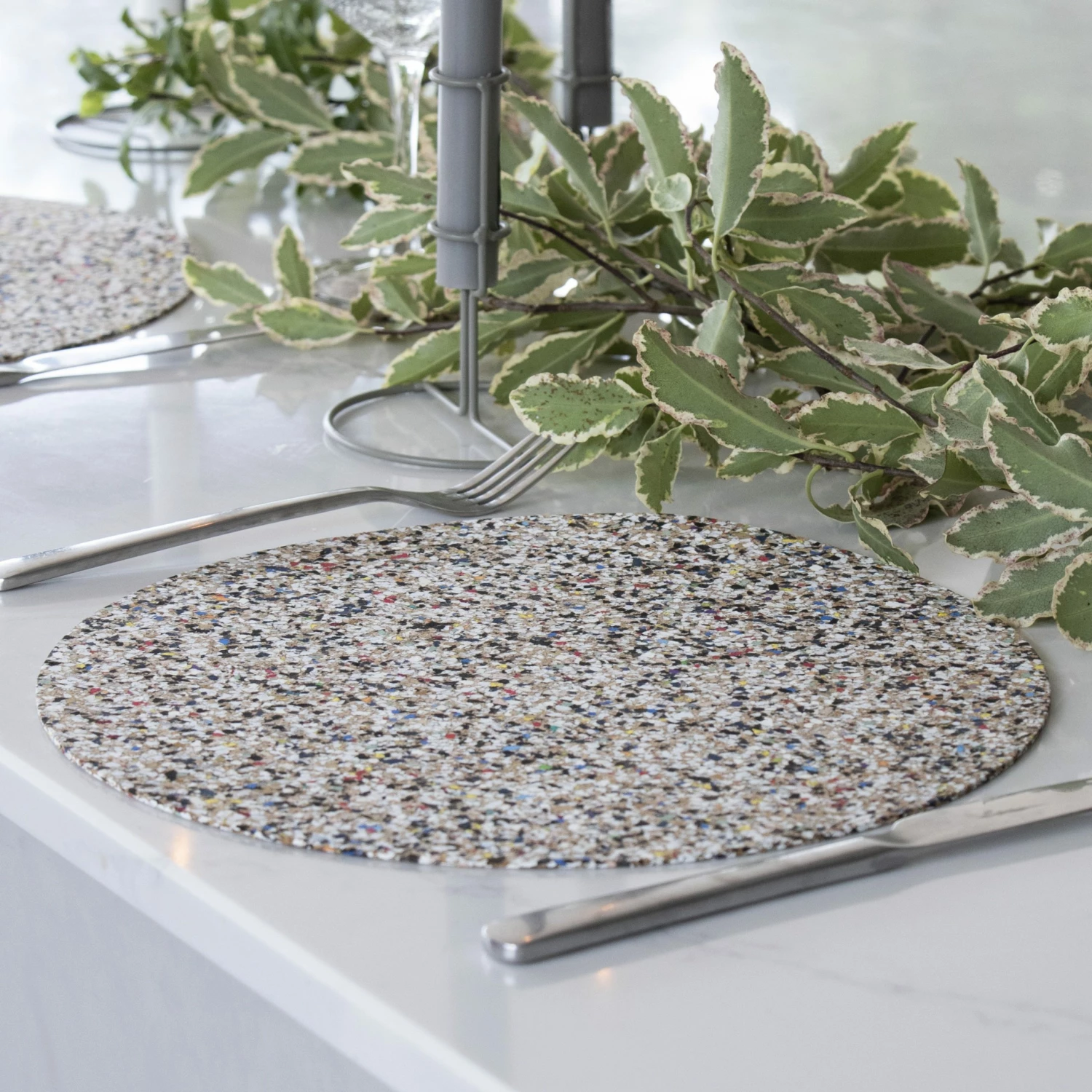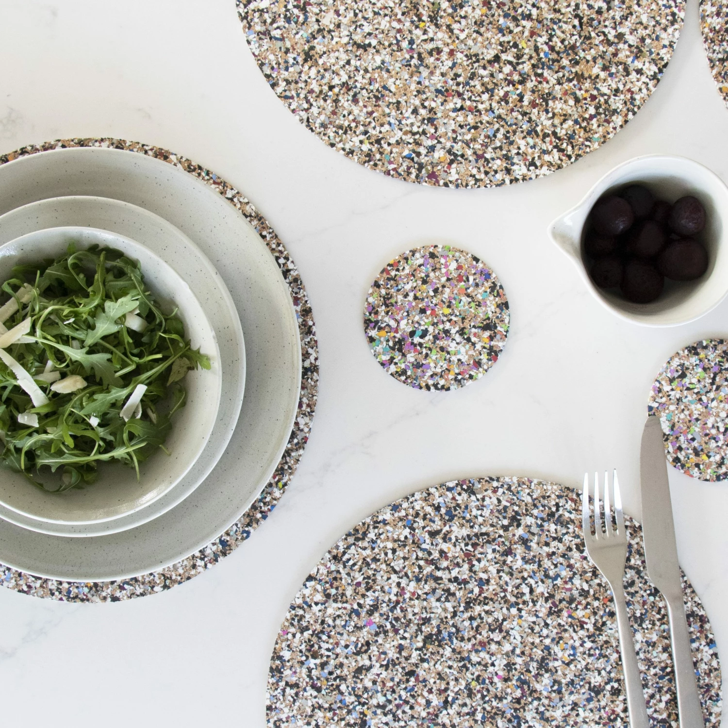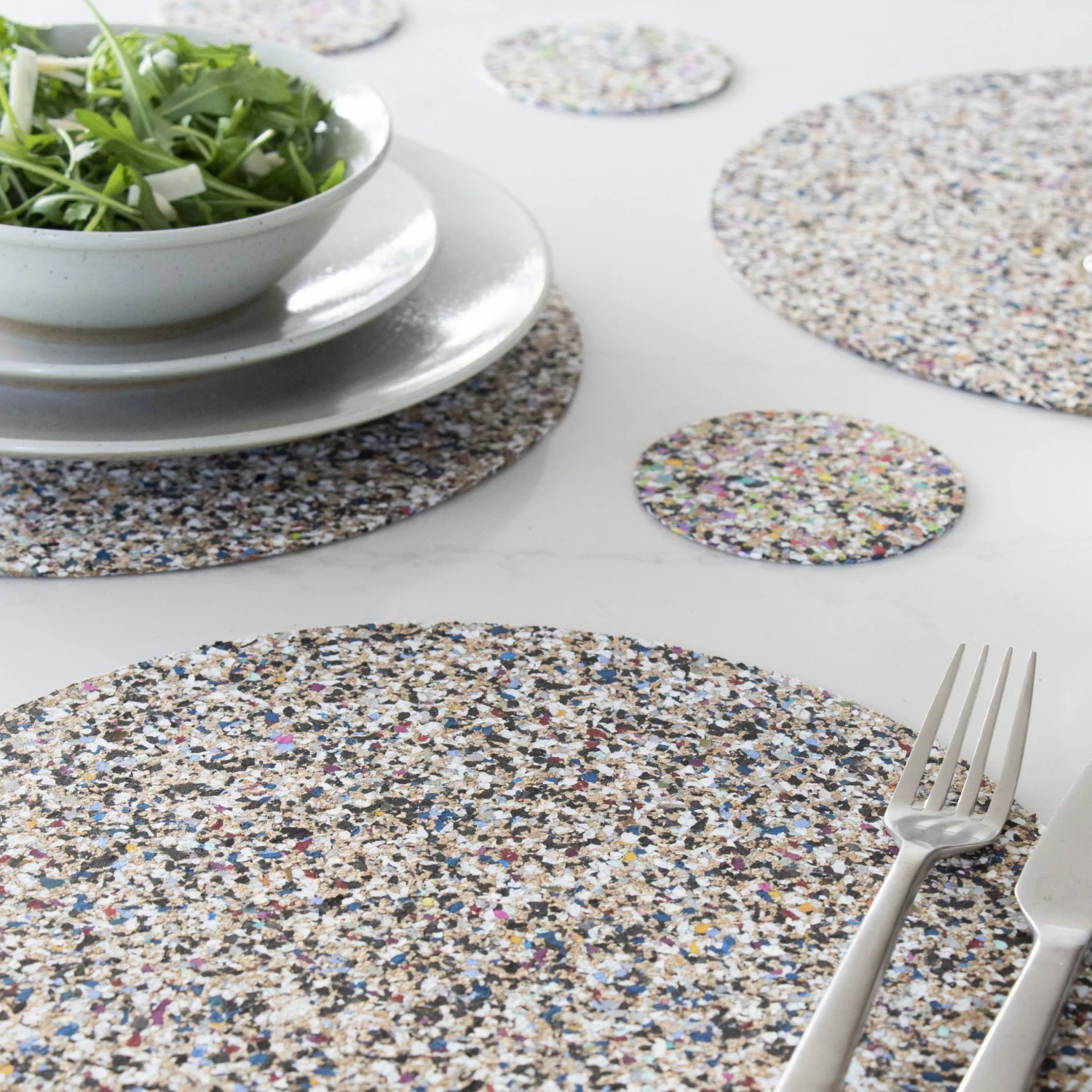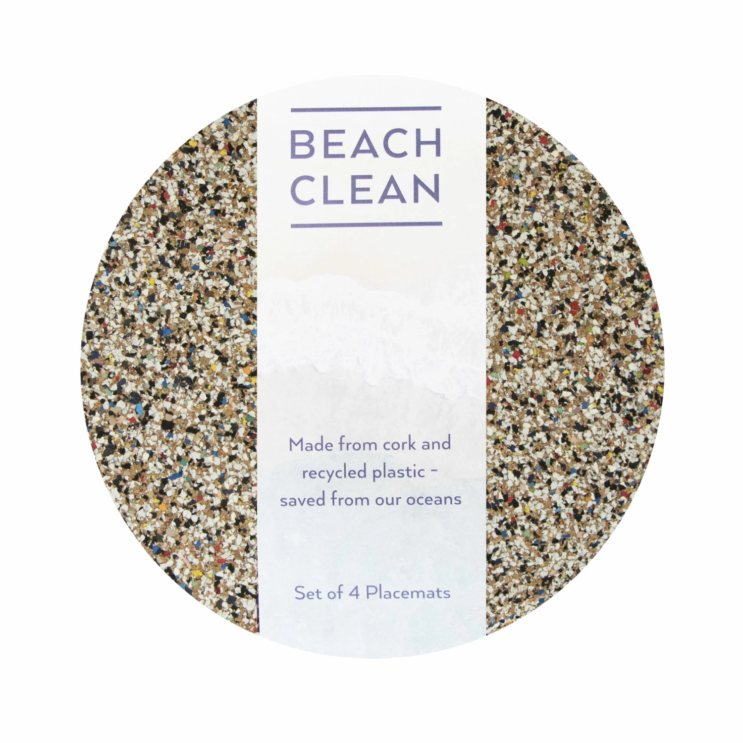 Sustainable cork plus recycled eva plastic saved from our oceans is equals to beach clean collection. Our new material that makes a difference. Set of 4 beach clean placemats. Made with recycled eva plastics, like flip flops and eco friendly cork. Easy to wipe clean. Please Note: Due to the process, every batch of mats may differ in colour of eva plastics making them unique in style and colour. Although the cork is heat resistant the eva food safe, plastics are not so therefor please do not use as a hot plate or trivet, however oven warmed plates are absolutely fine. Size: D30 x 0.2 cm, 4 mats in a set. Material: Cork and recycled eva plastic, saved from our oceans water and UV resistant. Our material that makes a difference. Earth friendly. Made from recycled eva plastics like flip flops plus eco friendly cork. Every sheet of beach clean is one of a kind, completely unique. Due to the use of recycled eva plastics, these mats are not heatproof.