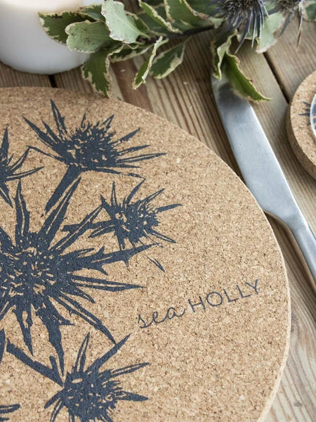 Placemat Made from cork Heat Proof and Water Resistant Eco Friendly Screen printed In Cornwall – Cork grown in Portugal. 25 cm x 1 cm Wipe clean with soap and water. Here we have the Sea Holly Placemat from Liga. Update your tableware with this lovely placemat! The Cork is all natural, heat proof, water resistant and soft to touch. The perfect eco material for placemats and coasters. Cork continues to absorb CO2 even as a coater – amazing.