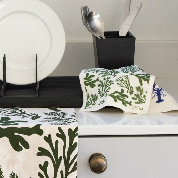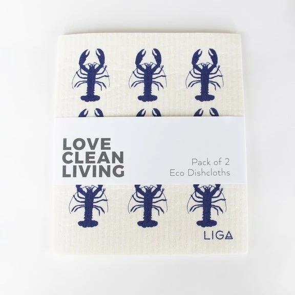 Liga’s Love Clean Living pack of two eco dishcloths. This pack contains two designs: seaweed and blue lobster. We also stock these lobster dishcloths in a seaweed and red lobster pack.