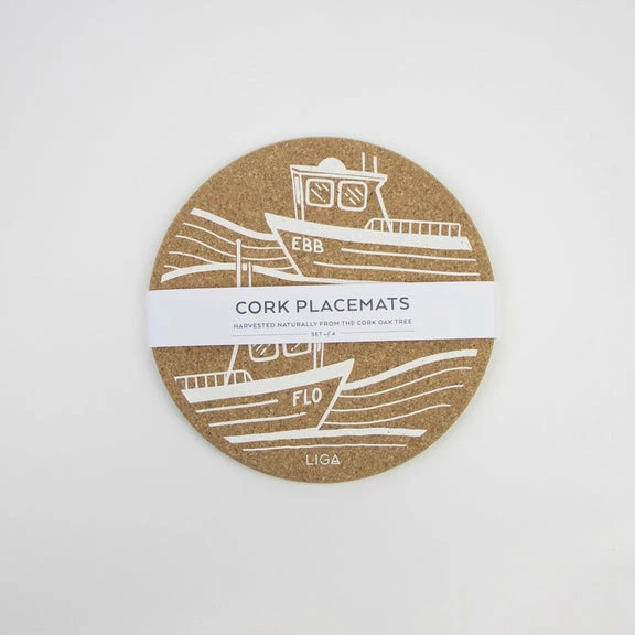 Placemats and coasters made with sustainably sourced cork. Cork also continues to absorb co2 even as a liga product. Made in: portugal and screen printed in cornwall. Size: D25 cm H10 mm.
