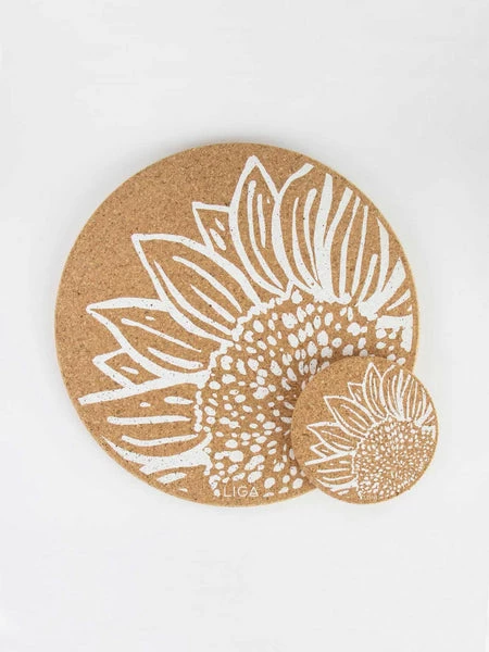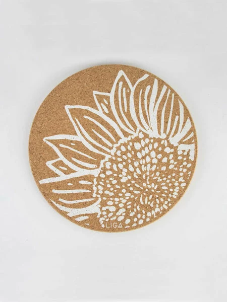 Placemat Made from Cork Natural cork with Sunflower design Size: D25cm x H10mm Here we have this Sunflower Cork Coasters from Liga. Cork – the perfect eco sustainable material; beautiful, practical, water & heat resistant and durable too. Liven up your dinner table with these, eco-friendly placemats, harvested naturally. Cork continues to absorb CO2 even as a coaster – amazing.