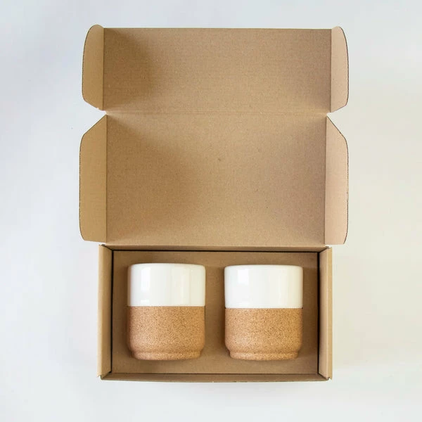 Cork + Pottery = Earthware Collection Two mugs made with eco friendly cork and ceramic packaged in a stylish gift box. The Cork and Ceramic parts sit well together and easily come apart for practicality and ease of cleaning. Ceramic – Dishwasher Friendly Cork – Handwash only Size: H9.5 W8 cm